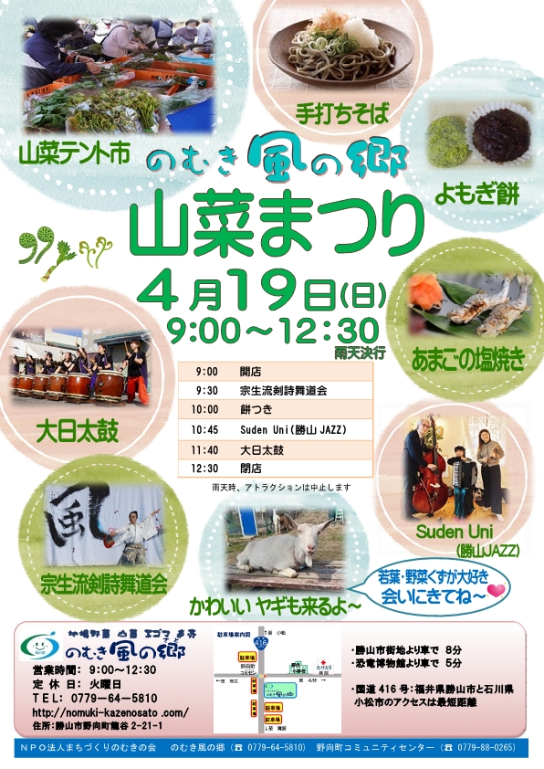4月19日(日)午前9時より、春の恵みを味わえる恒例イベント「山菜まつり」を今年も開催します。